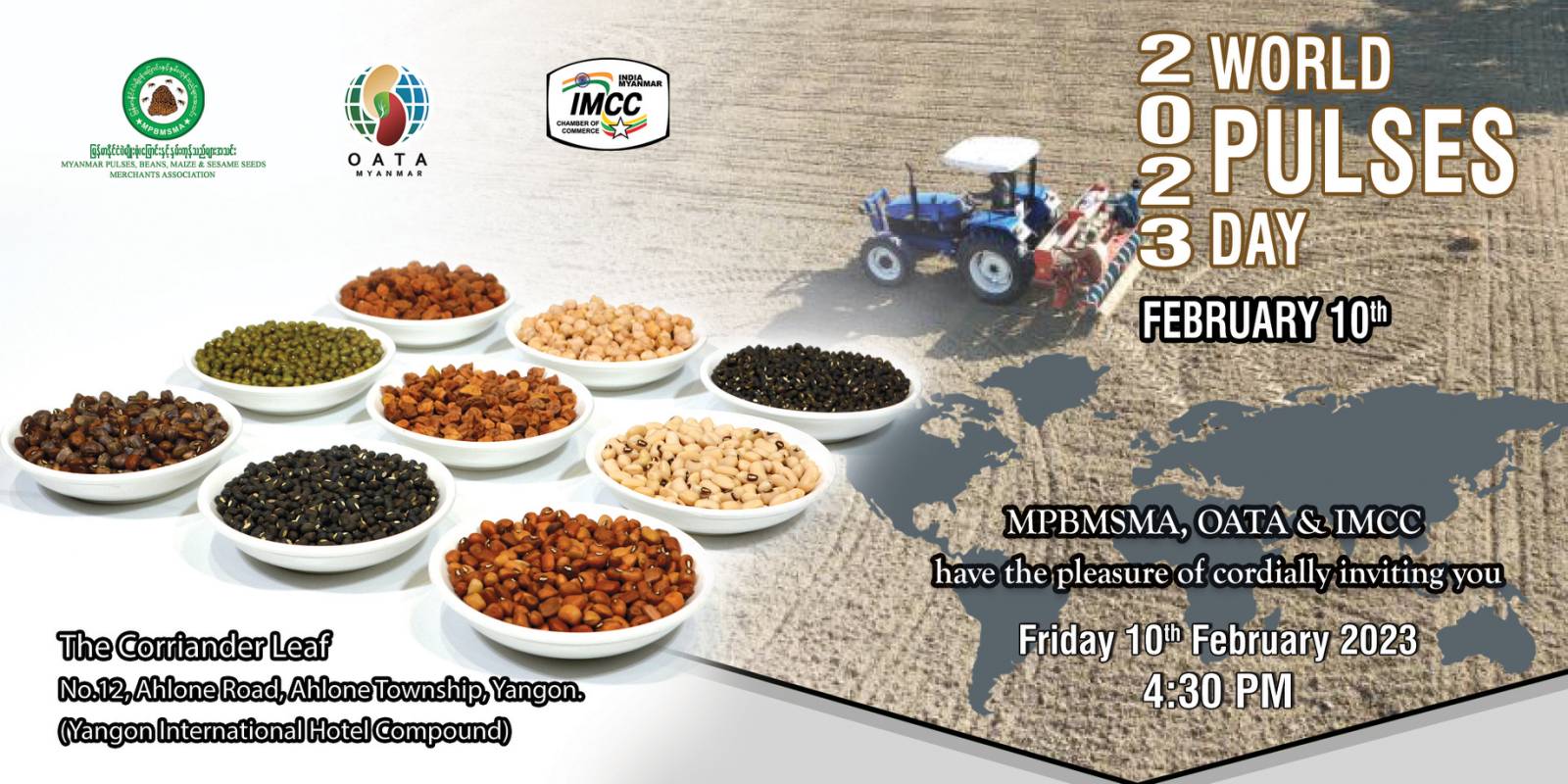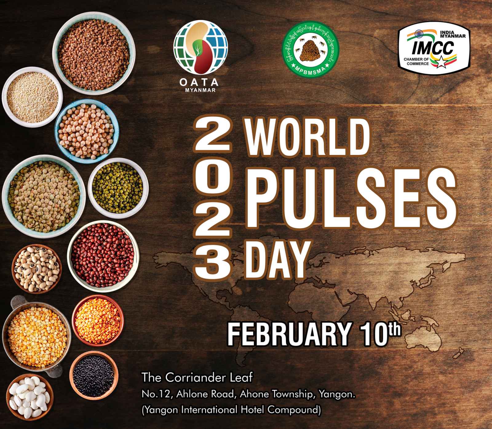 The World Pulses Day 2023 ceremony was held on February 10th in Yangon, the Coriander Leaf restaurant hall, Ahlon Road. It was jointly organized Myanmar Pulses, Beans, Maize and Sesame Seeds Merchants Association (MPBMSMA) India-Myanmar Chamber of Commerce and Industry (IMCC) and Overseas Agro Traders Association (OATA) Myanmar. The Ambassadors of India and Nepal, Vice President and teams from the Union of Myanmar Federation of Chamber of Commerce and Industry (UMFCCI); members and entrepreneurs from the organizing clubs attended in full.